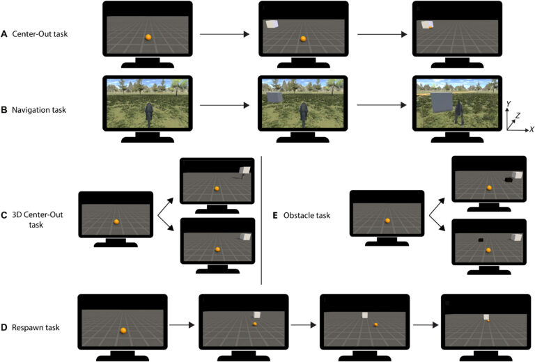 研究人员设计了五项任务验证系统有效性,逐步测试脑机接口能否应对避障等动态、不可预测的场景。实验装置在逼真的沉浸式3D VR环境中搭载动态相机追踪系统,可实现连续导航与避障,模拟真实世界场景。立体3D显示屏为猴子提供真实的深度感知,相比以往研究使用的2D屏幕是一项重要改进。