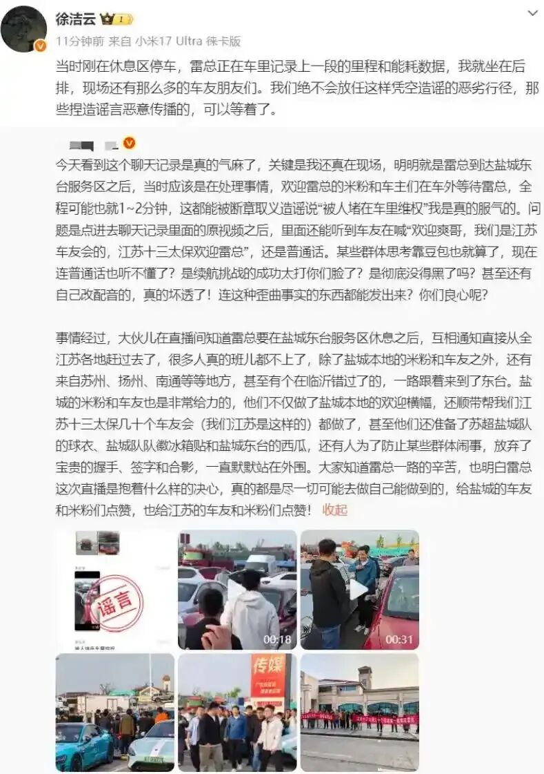 此外,据其转发的网友@回望风逝的博文显示,传言中所谓的“维权车主”,实际上是得知雷军要在盐城东台休息后,从各地赶来表示欢迎的江苏车友会米粉。
