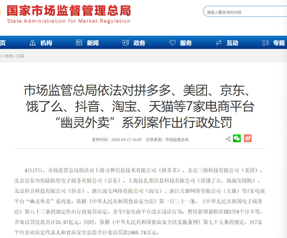 4月2日,市场监管总局召开外卖平台企业行政指导会,指导美团、淘宝闪购、京东3家平台企业严格落实即将实施的《网络餐饮服务经营者落实食品安全主体责任监督管理规定》,强化企业食品安全主体责任,采取切实有效措施,保障消费者饮食安全。