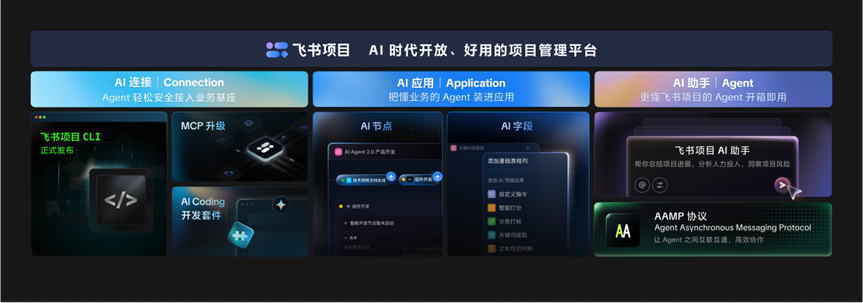 而飞书项目AI助手和AAMP则是从AI基建的视角进一步放大飞书项目的价值,即让AI以飞书项目的特色能力和企业知识数据为锚,进一步帮助每一个用户和AI一起用好飞书项目;另一方面让平台和智能体之间互通协作,让组织AI流程和个人AI生产力形成合力,释放极致生产力。