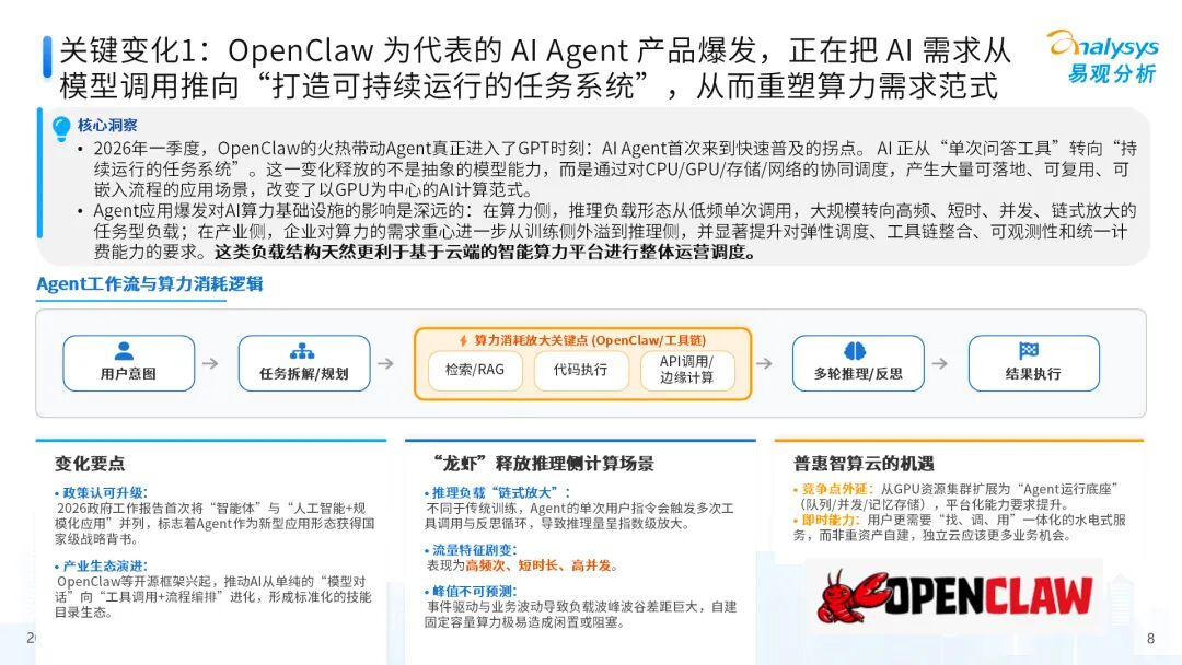 以OpenClaw为代表的新一代智能体产品,推动AI从“单次问答工具”演进为“持续运行的任务系统”,推理负载也因此呈现出高频、短时、并发、链式放大的全新特征。