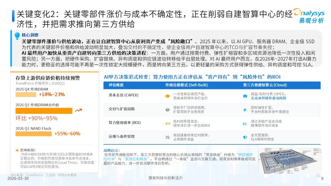 CPU、GPU、内存、企业级SSD等关键零部件的价格与供给不确定性不断增强,导致自建智算中心的资本性支出(CAPEX)、总拥有成本(TCO)以及扩容节奏越来越难以把控,因此越来越多AI终端用户选择转向第三方供给。