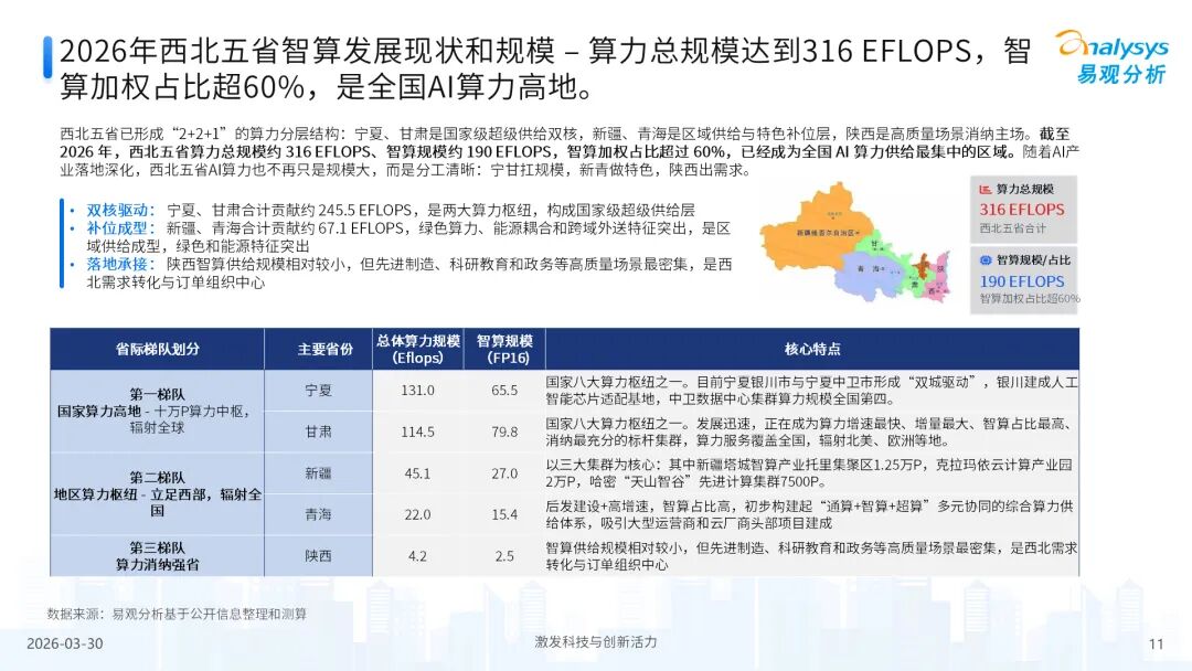 根据易观分析测算,截至2025年底,西北五省算力总规模约316 EFLOPS,其中智算规模约190 EFLOPS,智算加权占比超过60%,是全国AI算力供给规模最高的区域。