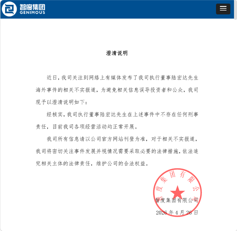 4月26日,智度股份第二大股东智度集团就此事发布澄清说明,表示网传公司执行董事陆宏达海外事件不实,其在相关事件中不存在任何刑事责任,目前公司各项经营活动均正常开展。