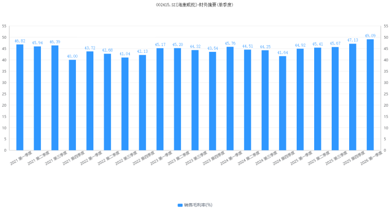 受益于AI技术的全面推广,海康威视毛利率有了明显的回升。财报数据显示,2024年第四季度至2026年第一季度,海康威视实现销售毛利率分别为42.16%、44.92%、45.41%、45.67%、47.13%、49.09%,毛利率连续六个季度实现同比提升。其中,2026年第一季度,海康威视毛利率已经创下近五年以来最高纪录。