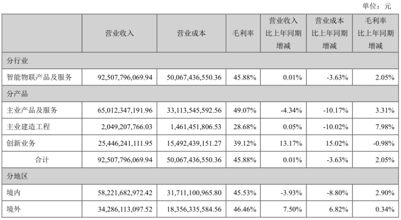 分业务来看,海康威视主业产品及服务业务实现毛利率为49.07%,同比增长3.31个百分点,创新业务实现毛利率39.12%,同比下滑0.98个百分点。分区域来看,海康威视境内业务毛利率为45.53%,同比提升2.9个百分点,境外业务实现销售毛利率46.46%,同比提升0.34个百分点,境外业务盈利能力持续优于国内业务。
