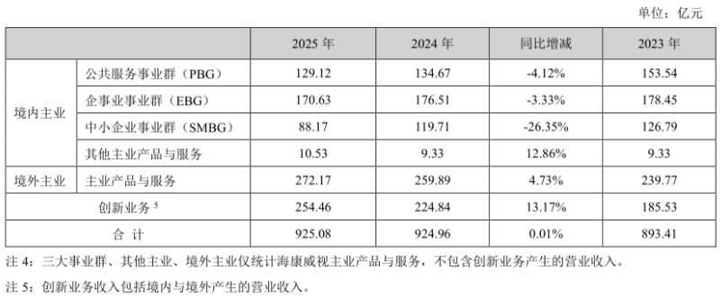 这其中,安防主业的下滑成为公司营收增长乏力的一个主要原因。数据显示,2025年全年,海康威视国内三大事业群均出现了不同幅度下滑。其中境内公共服务事业群(PBG)和大中型企业群(EBG)下滑幅度分别为4.12%和3.33%,中小企业事业群(SMBG)同比降幅高达26.35%。