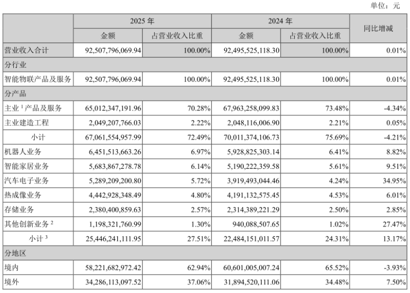 除了境外市场的稳定增长之外,创新业务的高增长也成为海康威视年报中的一大亮点。2025年全年,海康威视八大创新业务共实现销售收入254.46亿元,同比增长13.17%。其中,汽车电子业务实现营收52.89亿元,同比增长34.95%,增速最快。此外,海康机器人、萤石网络、海康微影等创新业务稳居细分赛道龙头,成为公司新的增长引擎。