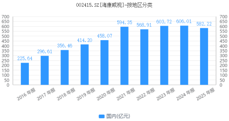 但需要注意的是,尽管创新业务保持了较高的增长,但仍未能完全对冲掉国内安防主业的下滑对于海康威视国内业务的冲击。2025年全年,海康威视国内业务共实现营收582.22亿元,同比下滑4%,这也是海康威视国内业务总营收首次出现负增长。