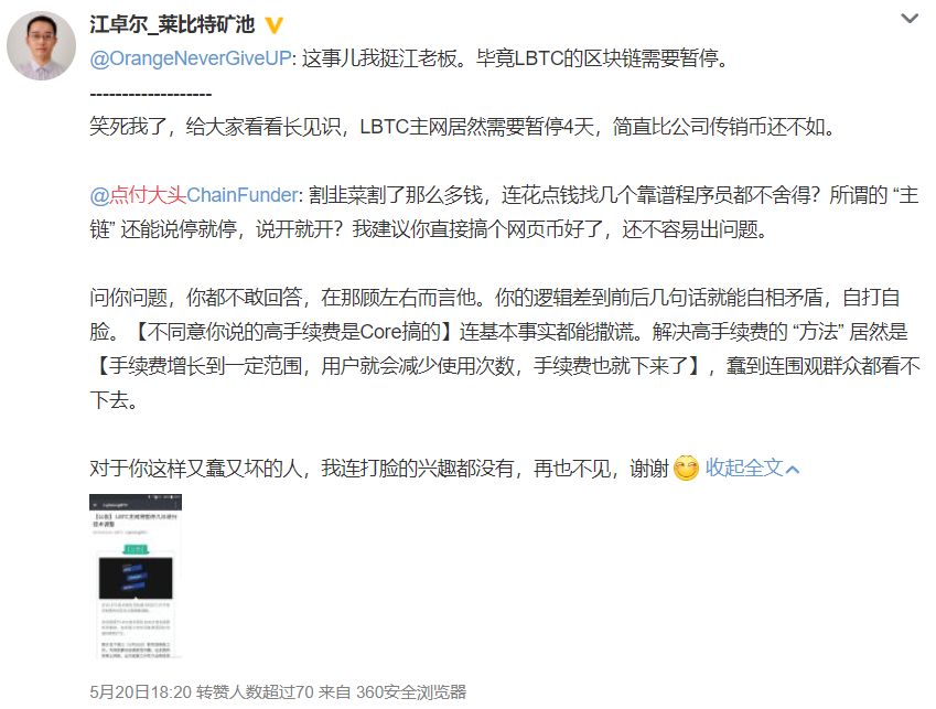 比如说,闪电比特币LBTC就因为主网上线后又因技术不过关宣布暂停(区块链还能暂停?),被人拿来手撕。