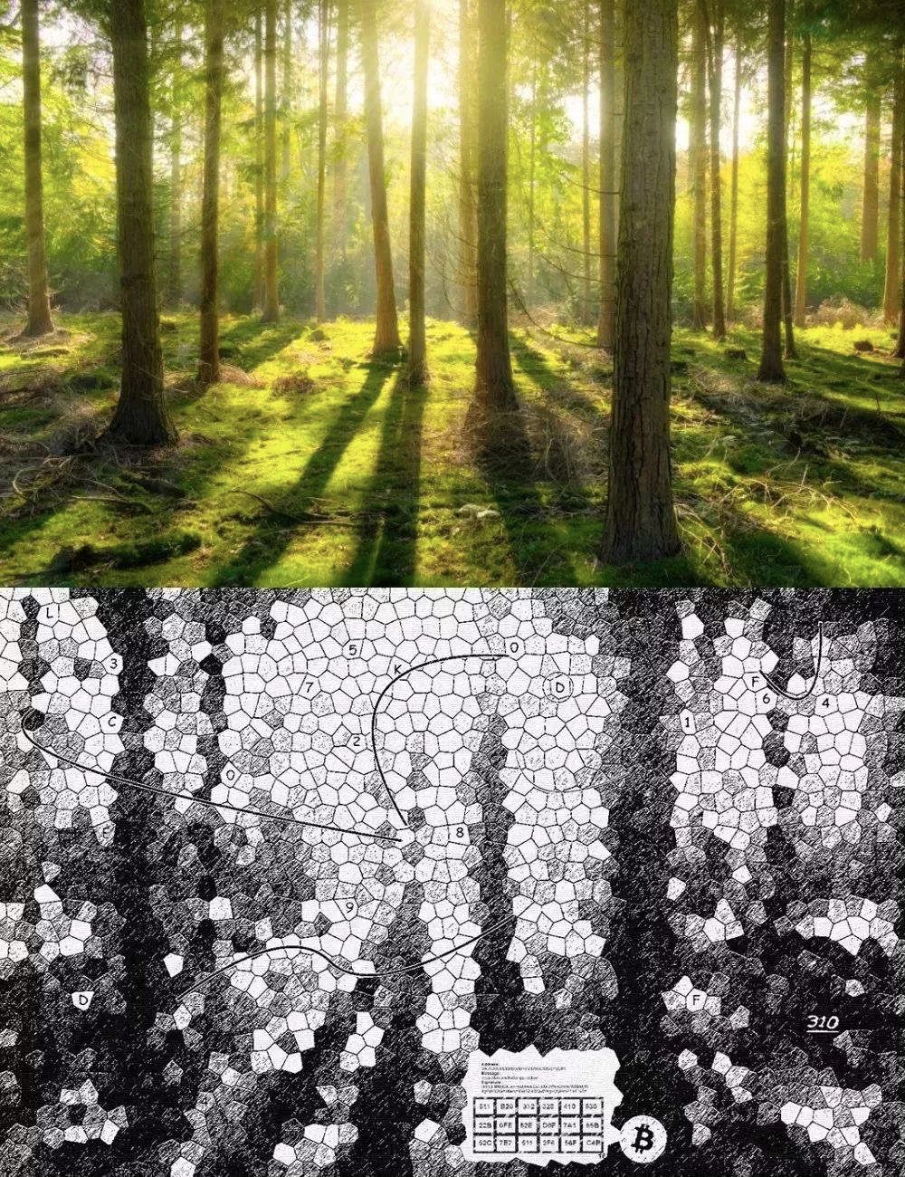 原图是一片绿油油的森林,经过模糊等后期处理之后,变为了隐藏310比特币的「宝藏线索图」。