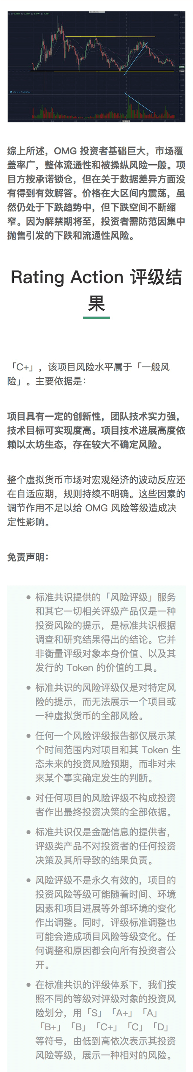 依据「标准共识一般项目投资风险评级标准(初创期)」 OmiseGO 获得「C」评级的主要原因是:项目具有一定的创新性;OmiseGO 项目对以太坊生态依赖性很强,目前技术进展缓慢,基于以太坊的 plasma 架构尚未实现、分布式交易模块实现度不够高。
