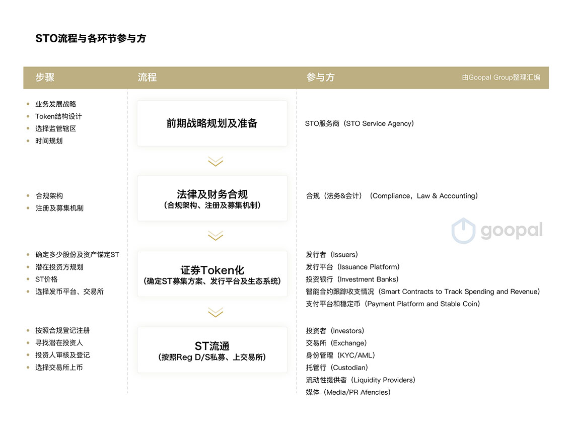 对于任何资产而言,流动性是价值流通的保障,倘若只是单纯地完成资产证券化和证券通证化,而没有流动性或者看不到流动性的可能,那依然不能成为真正合格的STO项目。在我看来,一个合格的STO项目包含以下四个环节:前期战略规划及准备,法律及财务合规,证券的Token化以及ST的流通,四个环节递进关系、环环相扣,最终形成一个完整的STO商业闭环。