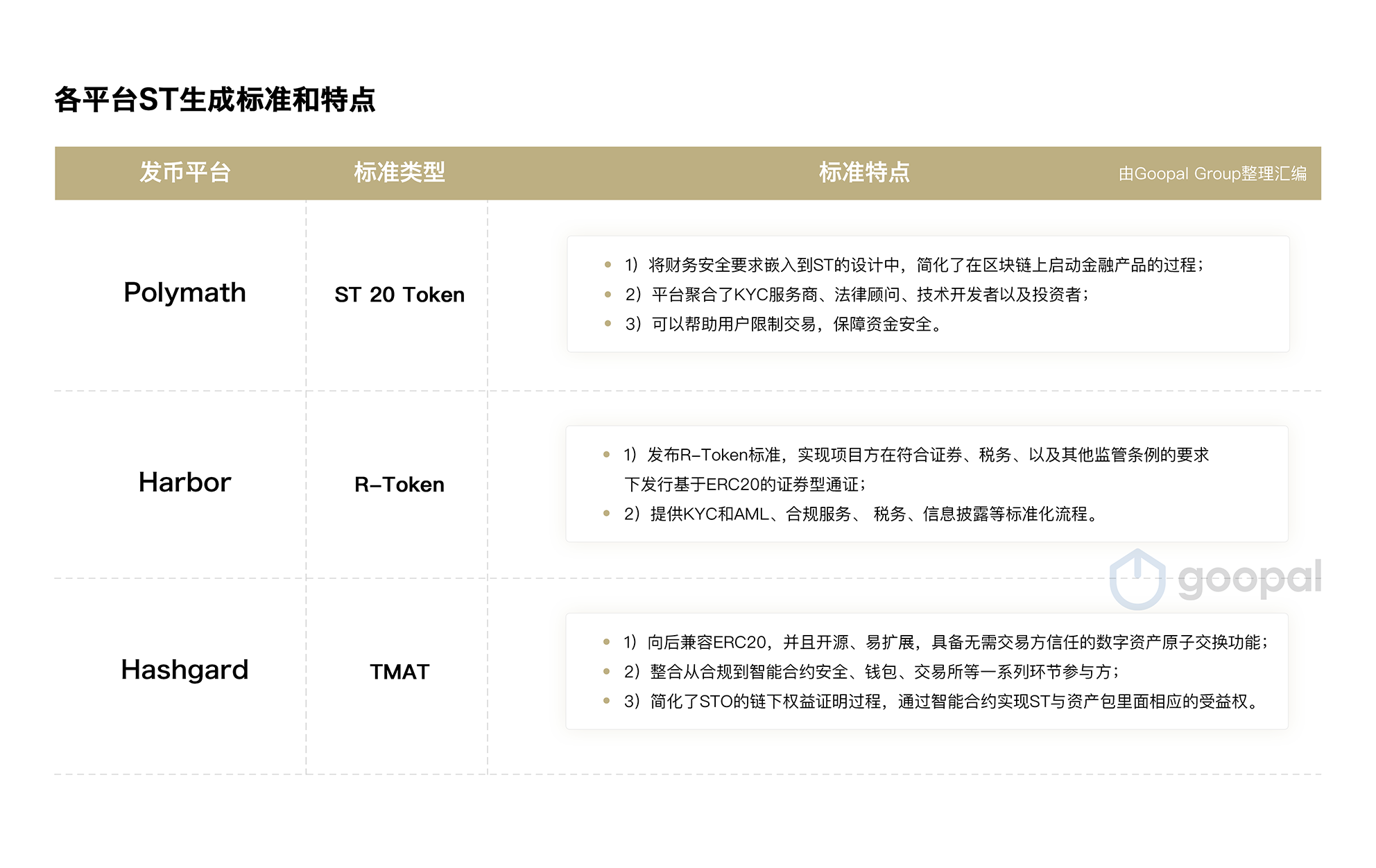 目前,由于STO的飞速发展,提供一揽子解决方案的ST生成和发行平台也越来越多,他们各自专注解决的问题各有侧重。有些平台专注于证券型通证的发行,如Polymath和Harbor;有些平台专注于证券性型通证的交易如OpenFinance、TZero、Vdax;也有些平台提供证券型通证的发行和交易功能,如Templum;有些平台则更加专注着私募基金的管理和流通如Securitize。对于项目方和投资者来说,可以依据自己的具体需求,在这些平台中进行相应选择。
