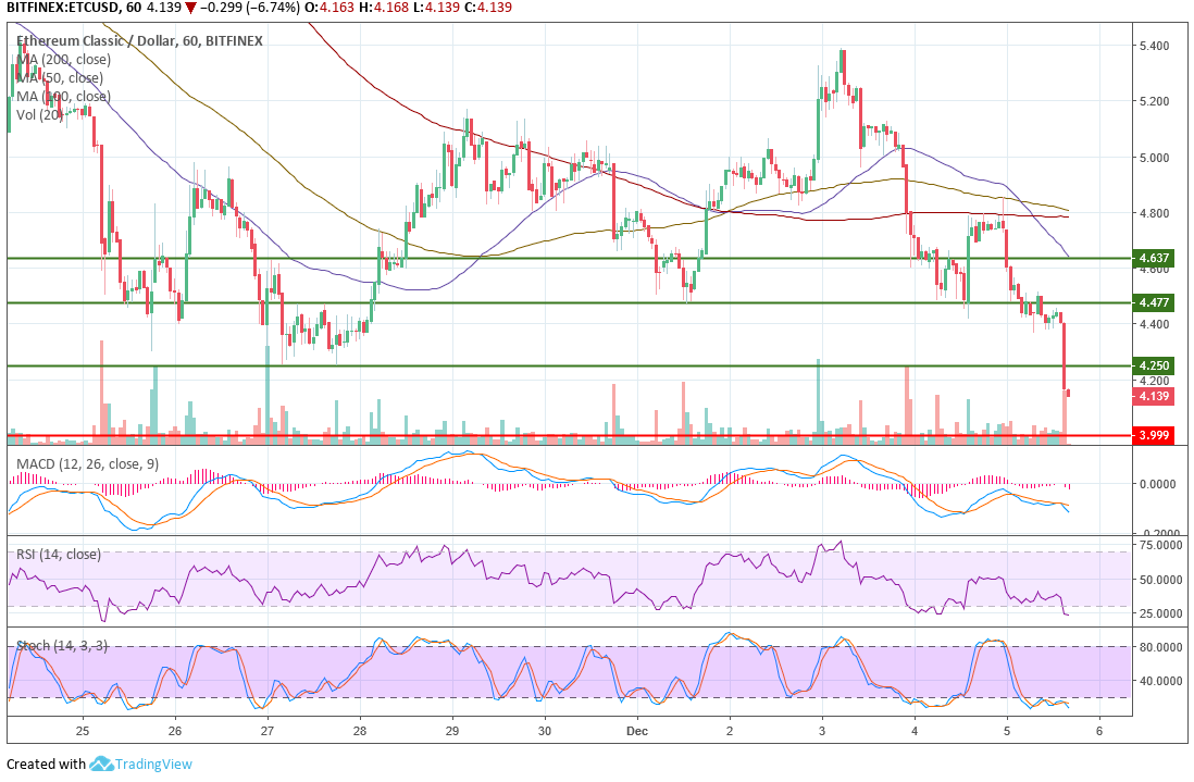 作为今天白盘领跌主流币种的两大币种之一,ETC在日内这波快速下跌行情走出后,已经完成了对于上个月月底创出的近期低点支撑的初步跌破,受短线一波加速下跌行情带动,目前50小时均线已经实现了对于100及200小时均线的下穿,短期均线系统转空信号趋于明朗。