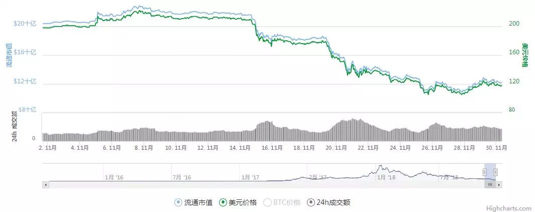 11月(11月1日-11月30日),全数字货币资产总市值总体呈下跌走势,11月中旬大盘跌破2000亿美元的关卡,随后整体平缓下跌。收盘价为1380亿美元,较开盘价2054亿下跌674亿美元,跌幅为32.81%。