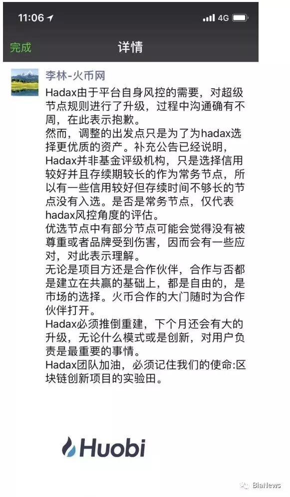 对此,火币网CEO李林也马上回应,在朋友圈表示对超级节点规则升级过程中的沟通不周表示抱歉。