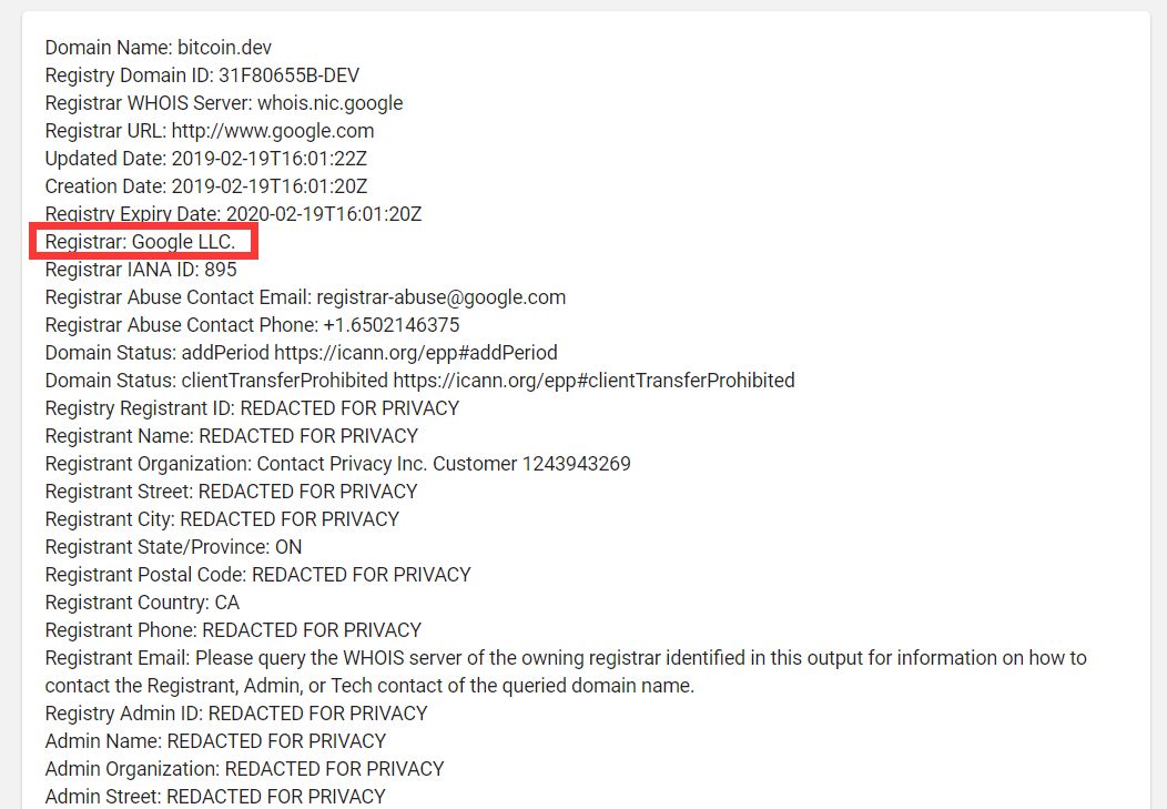 在谷歌开放“.dev”顶级域名之后,“Bitcoin.dev”已经被这家公司注册了,同时还包括“blockchain.dev”。