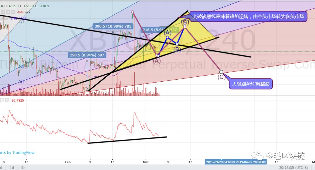 综上、4小时级别底背大概率会得到确认,并且在未来三四天内打到B点(B末点在3月9号附近),之后开始走大级别C浪,如最后一张图所示,C浪末端在日线级别那篇文章,观点不成立的话,突破倒数第二张图的黑色趋势线或者走出黄色区间,则观点不成立,严格止损。
