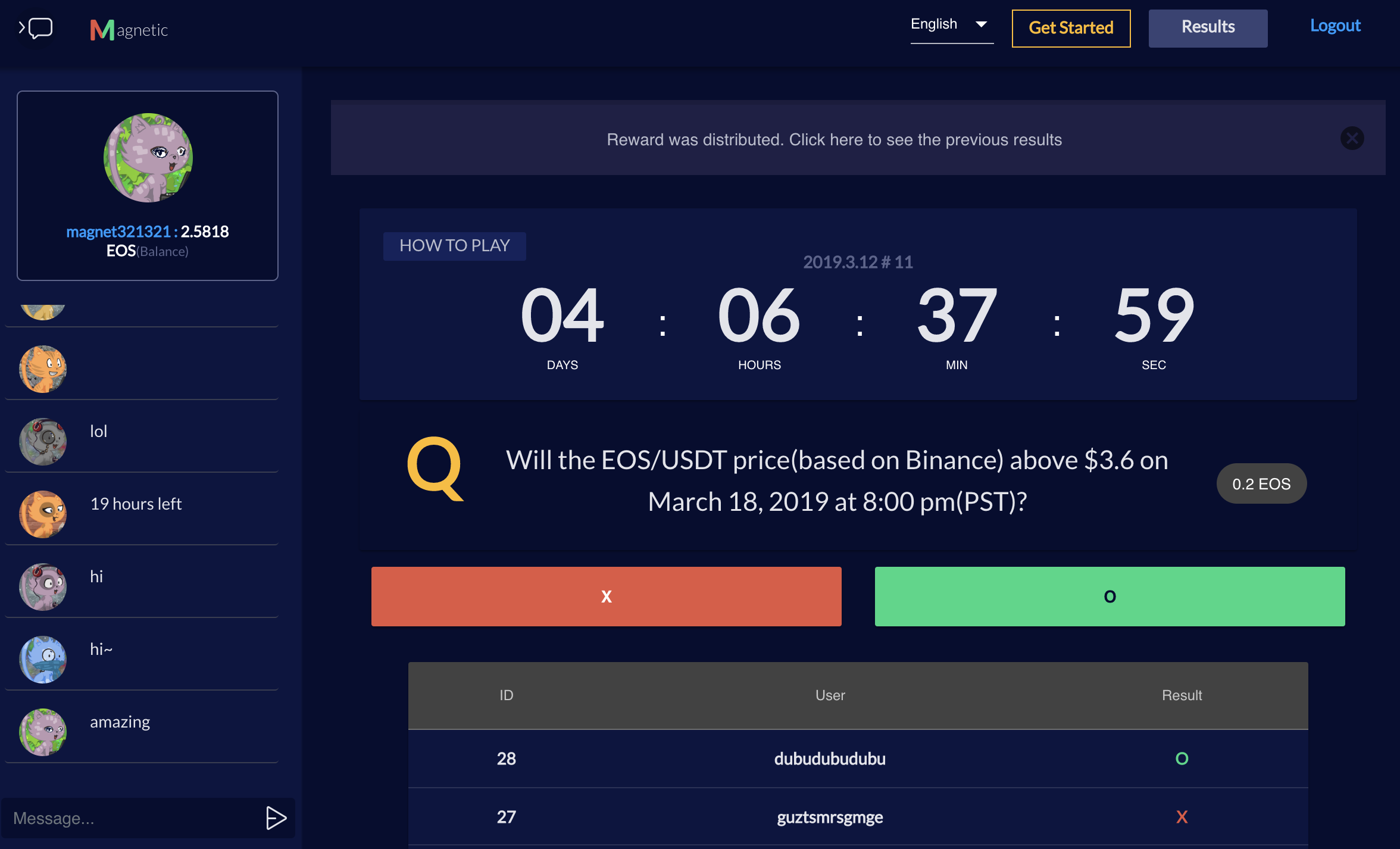Magnetic是一个基于EOS的预测测验社交游戏,规则不能再简单了。它允许玩家参与一些有趣的预测问题,并在预测正确时补偿Token。现在试试你的运气并赢得一些代币!
