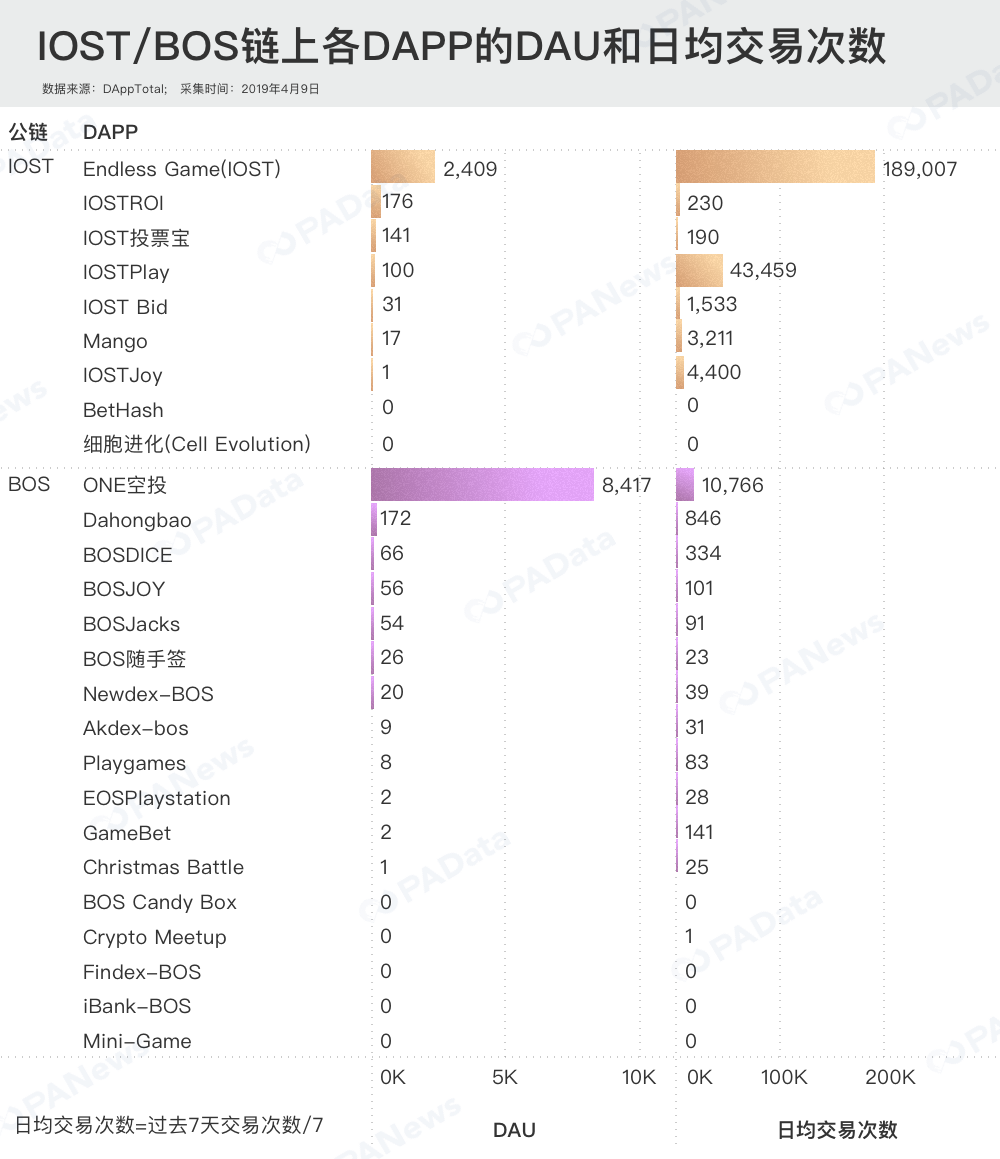 PAData仔细分析各个DApp的数据后发现,IOST和BOS都只有1个DApp在“撑场子”。在IOST上,EndlessGame(IOST)的DAU(日活用户数量)达到2409,远超过DAU排名第二的IOSTROI,甚至就算其它8个DApp的DAU加起来也比不上Endless Game(IOST)。与DAU密切相关的日均交易次数也呈现这样的格局,Endless Game(IOST)过去一周的日均交易次数达到189007次,占IOST链上所有DApp过去一周日均交易次数的78%。