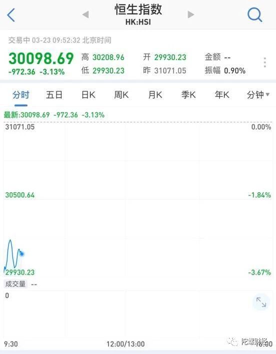 而香港股市也不可避免大跌:香港恒生指数开盘跌3.7%,下跌1140点失守三万点关口。