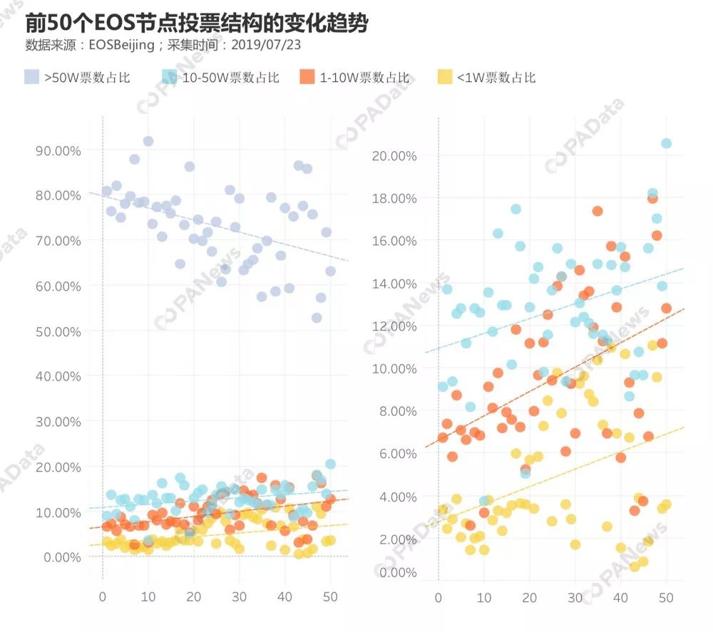 如果将观察的范围扩大到前50个节点,甚至前100个节点,都可以发现大于50万票的账户占绝对主导地位,但随着名次的下降,50万票以上的账户的影响力略微下降,其他量级的账户影响力略微上升。必须强调的是,排名高低与各量级账户投票多少之间并不构成相关性,也即从第1名超级节点到第100名候选节点,都是50万票以上的账户起绝对主导作用。