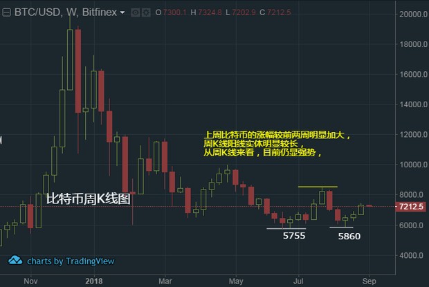 上周(8月27日至9月2日)比特币录得上涨,周K线录得三连阳,当周涨幅593,在上周7天的时间里,中间三天走势为横盘强势整理,周初和周末都出现较强势的上涨。从周K线图上看,上周比特币的涨幅较前两周明显加大,周K线阳线实体明显较长,从周K线来看,目前仍显强势,周K线上看,还有上行的空间。