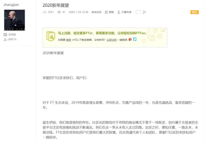 2020 年 2 月 14 日,在 FTFan,这个专为 FCoin 用户、忠实粉丝开放的多语言论坛上,有人打出了这样一句话,以此宣泄对 FCoin 官方团队失联多天的失望与愤懑。