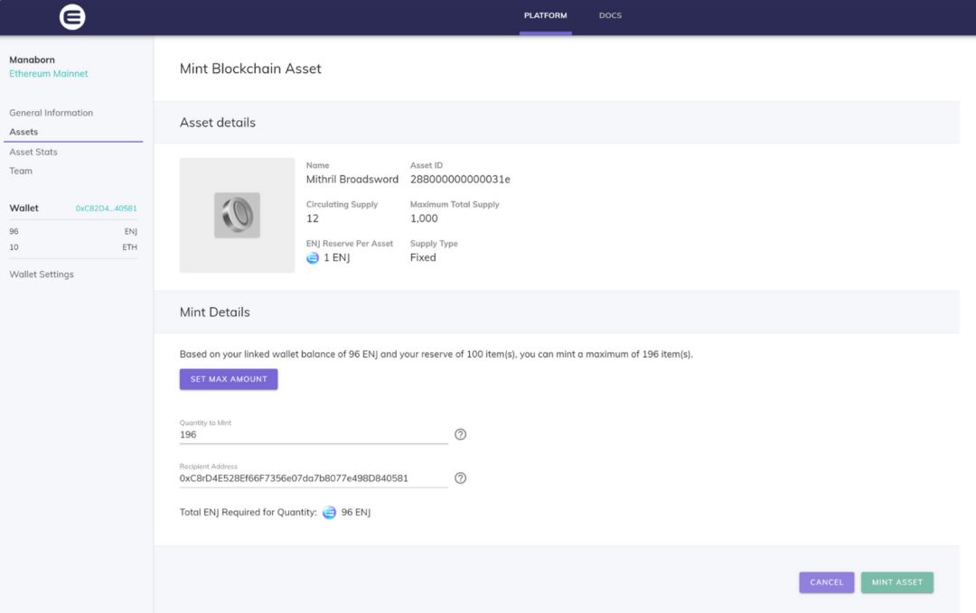 您在创建资产时选择的初始供应价值实际上是您的初始铸造“预算”,在那里可以确保要铸造的ENJ数量充足,并为/可以/铸造的资产数量提供上限。