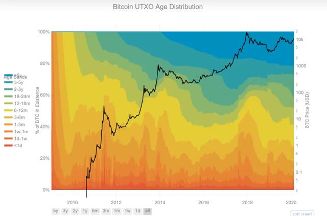 有3个主要的比特币HODL Wave,其中最古老的是BTC UTXO,它们在5年或更长时间内没有移动过。这些是最早开采比特币,也是比特币创建者和早期采用者的藏身之地。