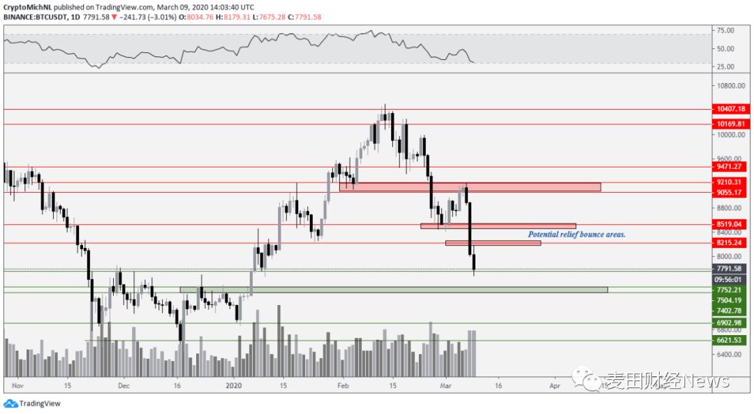 大家可能会关心,比特币价格是否会一下子就下跌到7300美元至7500美元的水平。目前来说,因为价格已经出现了如此大幅的下跌,所以。预计可能会出现小幅的反弹,应该会停留在7800美元的支撑位,并通过该支撑位进一步向上试探。