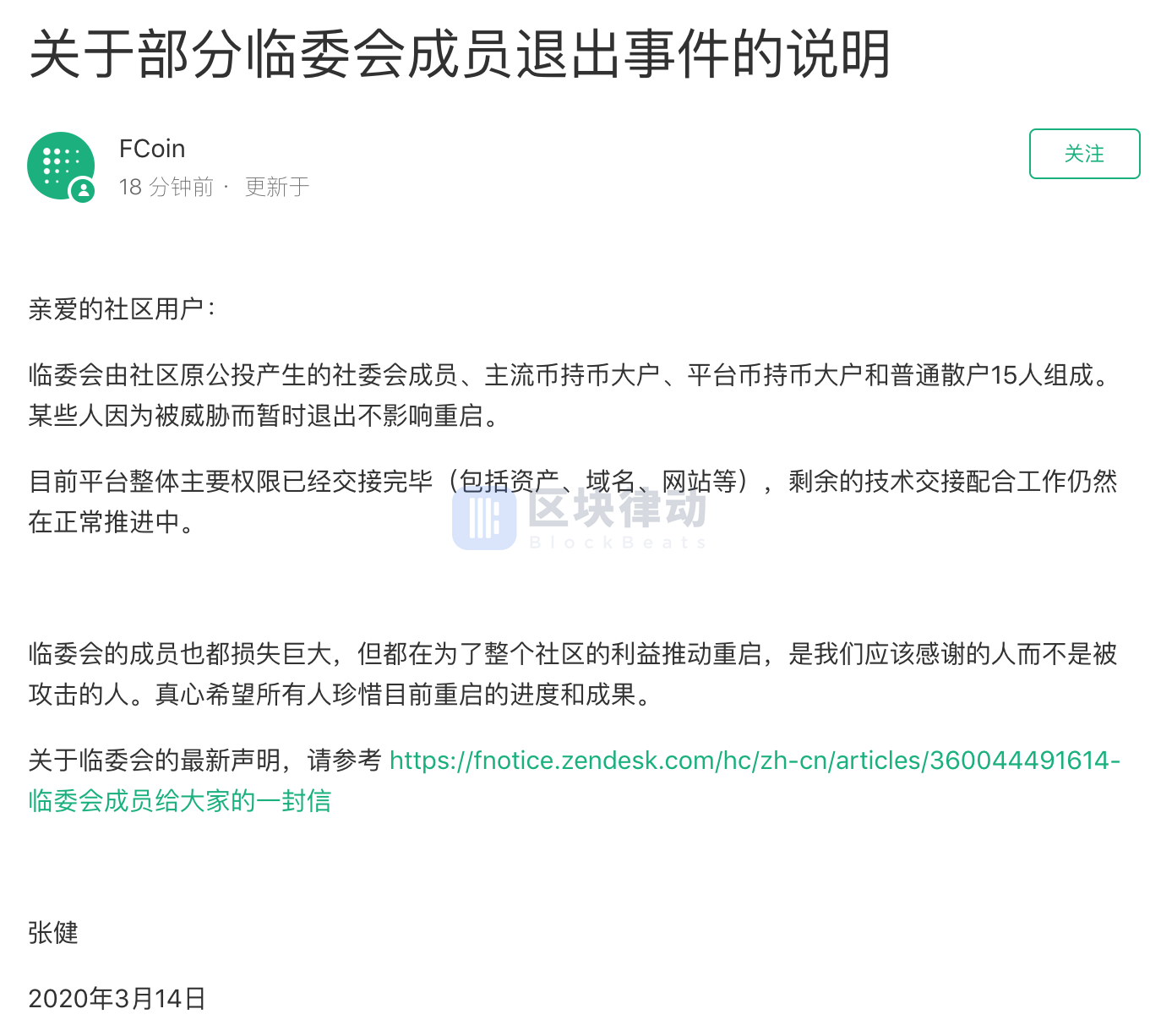 区块律动 BlockBeats 消息,据 FCoin 官方公告,张健称临委会某些人因为被威胁而暂时退出不影响重启,剩余的技术交接配合工作仍然在正常推进中。